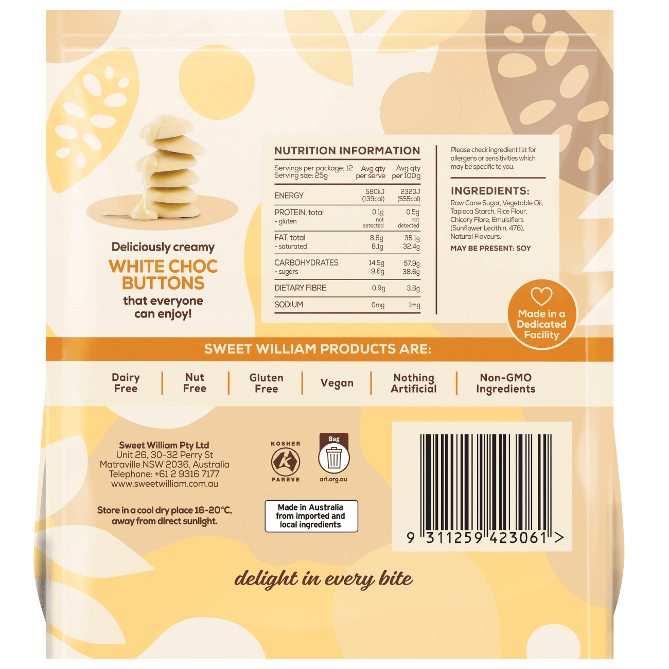 Dream up a sweet new recipe for these babies, they are delish! Our white choc buttons are ideal for melting and can work their way into any recipe.